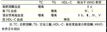 血脂异常临床上常分为高胆固醇血症、高甘油三酯血症、混合型高脂血症和低高密度脂蛋白胆固醇血症,具体分类如下表: