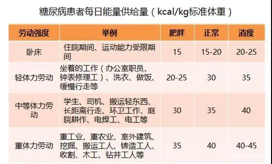 糖尿病患者应注意能量摄入和能量消耗保持平衡,每日能量供给量与年龄、体型、劳动强度等因素相关,一般来说: