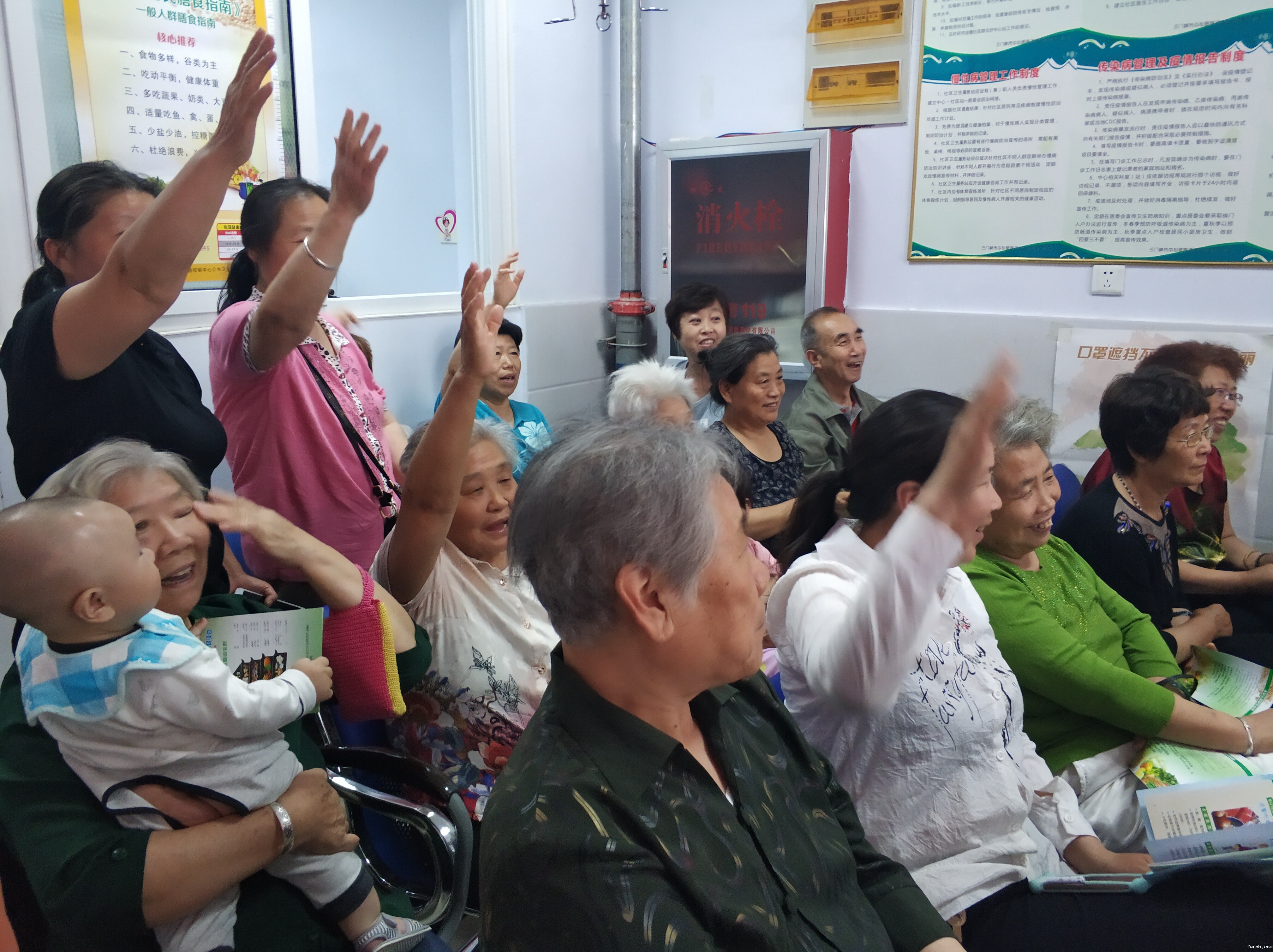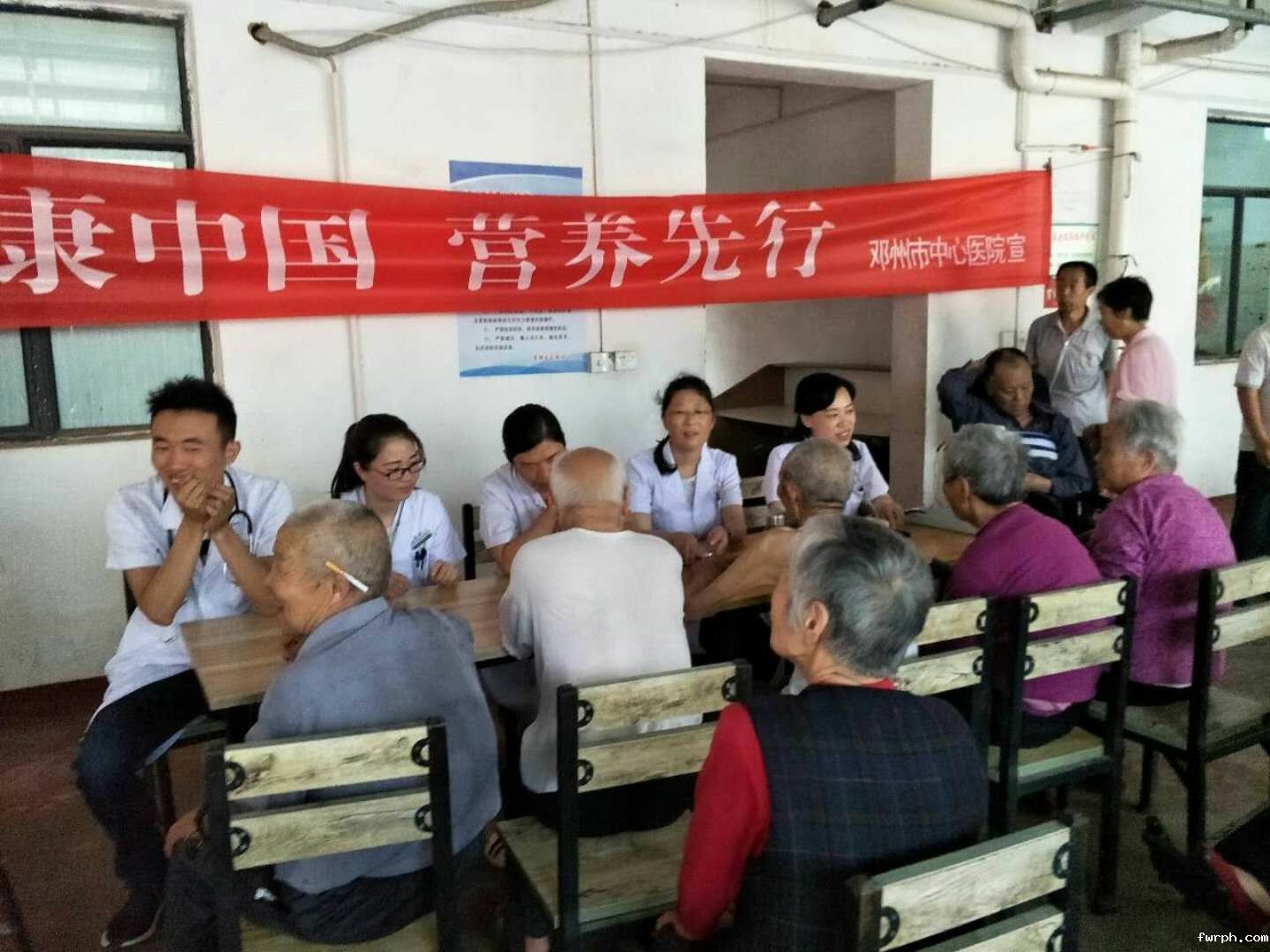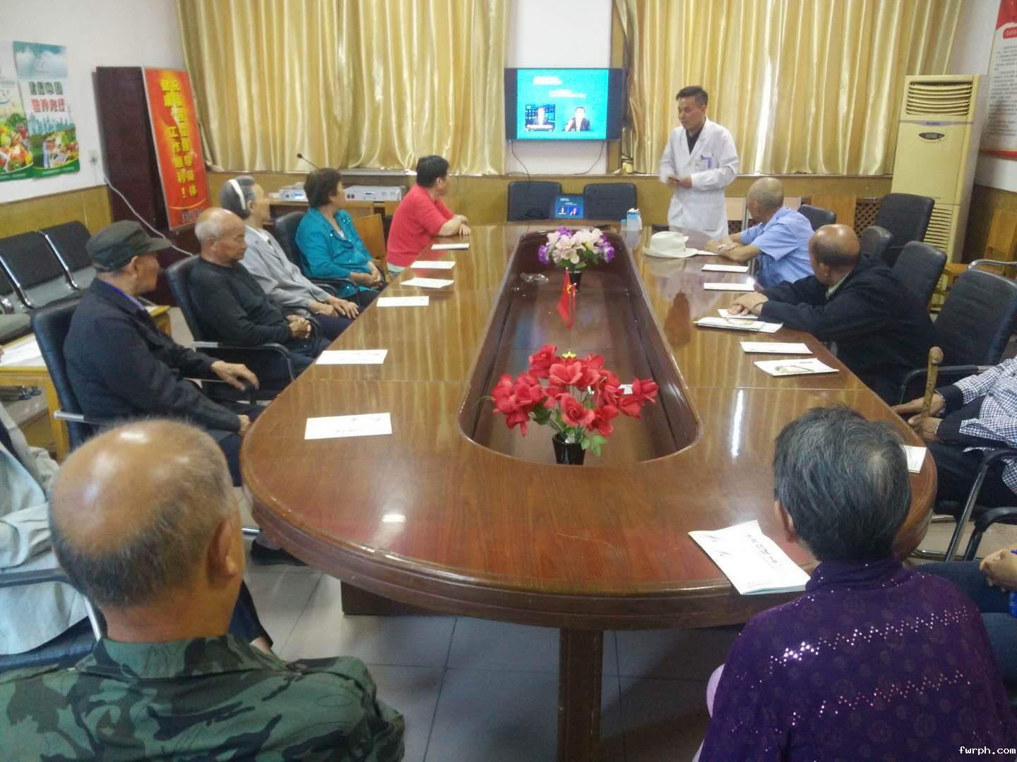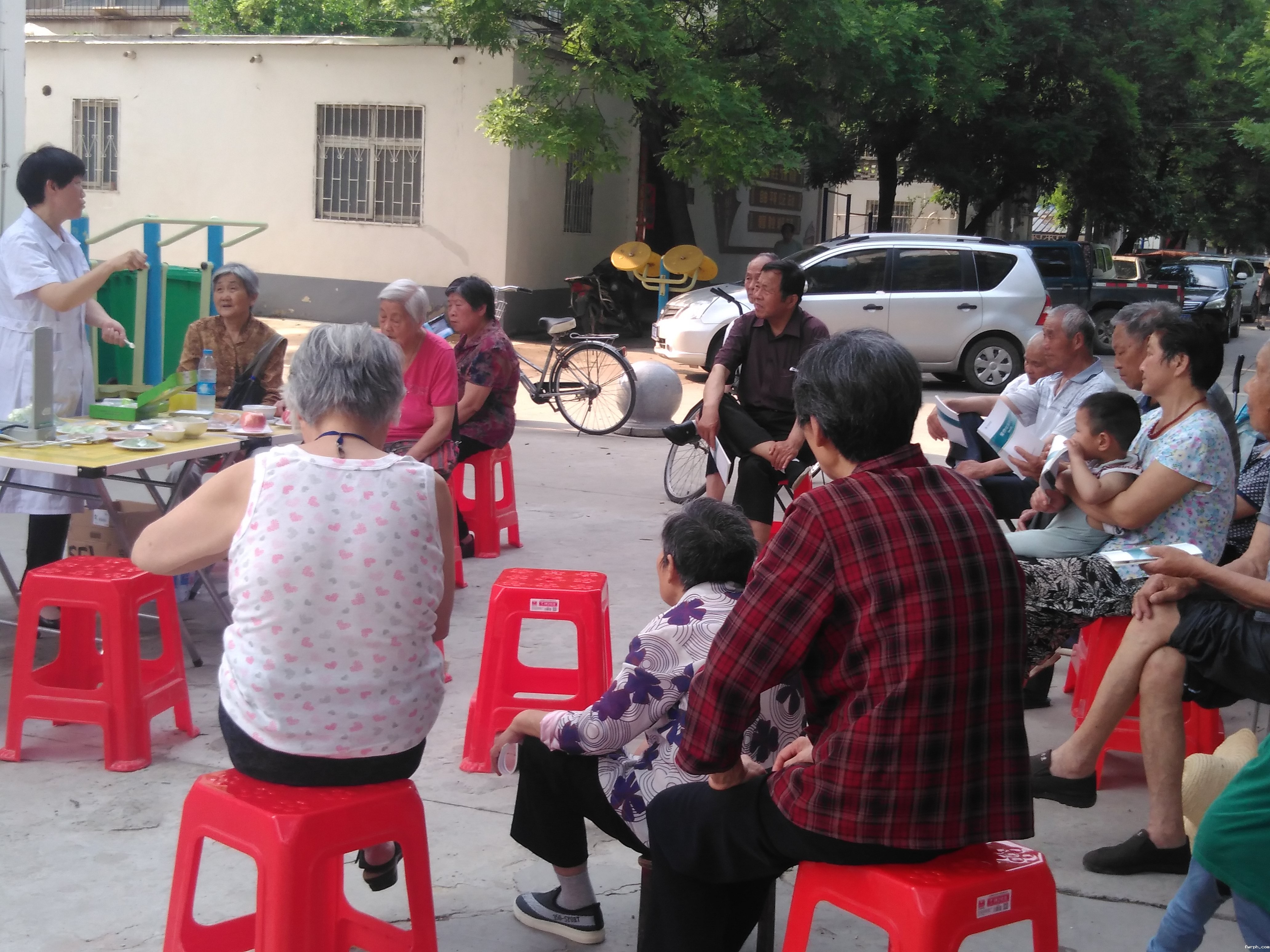 围坐在一起,听专家讲解营养知识:驻马店市沙厂社区,驻马店市精神病医院营养科正在进行营养周宣传