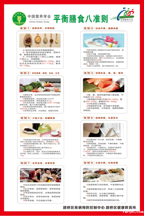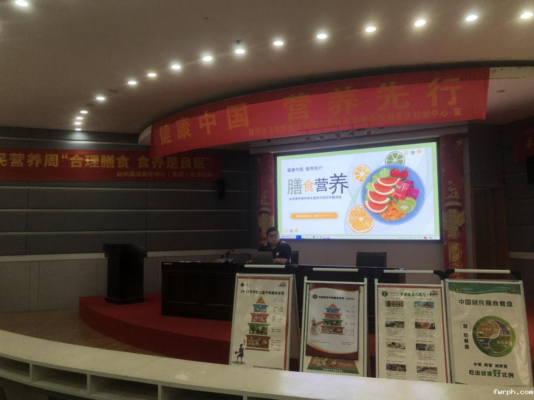 路桥区疾控中心在路北中心小学、路桥区南官小学、路南街道长浦中心小学、路桥区桐屿街道中心幼儿园、路桥区路北街道中心幼儿园悦宾府分园、路桥区路南街道中心小学、路桥区峰江街道保全小学、台州皇冠假日酒店、路桥区夜泊餐饮店等10家准营养健康食堂(餐厅),指导并宣传全民营养周活动,在各个营养健康食堂(餐厅),食客们在大快朵颐之余,了解合理膳食的重要性。