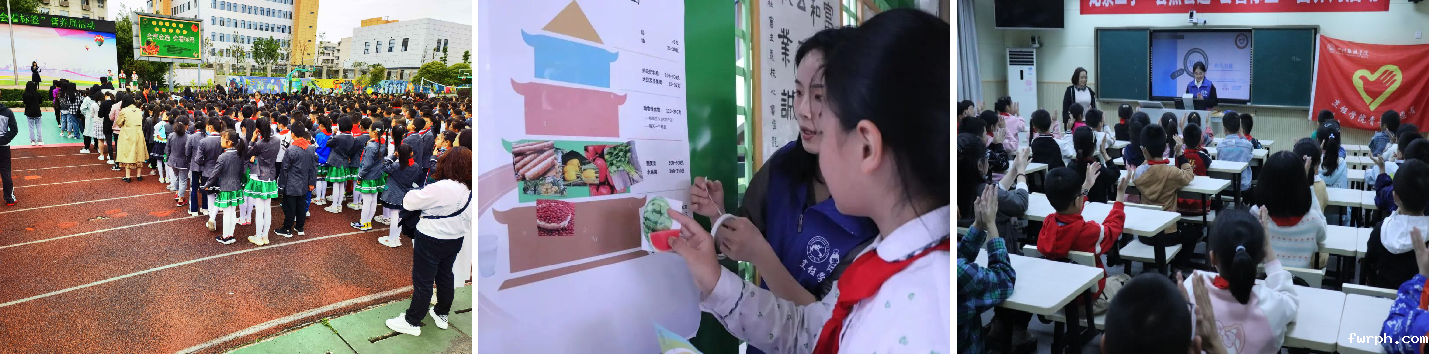 5月16日,由孟甜老师带领青年志愿者队伍前往龙泉二小,在全民营养周启动仪式上,向近3000名师生简要介绍了中国居民膳食指南平衡膳食八大准则。5月20日,烹饪学院青年志愿者队伍前往龙泉二小为小朋友们开展平衡膳食宝塔的知识培训,通过游戏的方式让小朋友们参与进来。在全校班会时间把平衡膳食宝塔的知识培训对每个班进行投屏,再次结合游戏来加强学生的知识巩固。