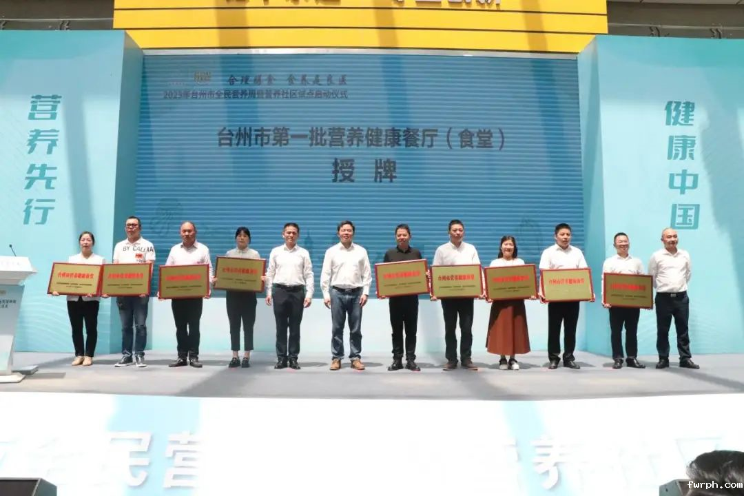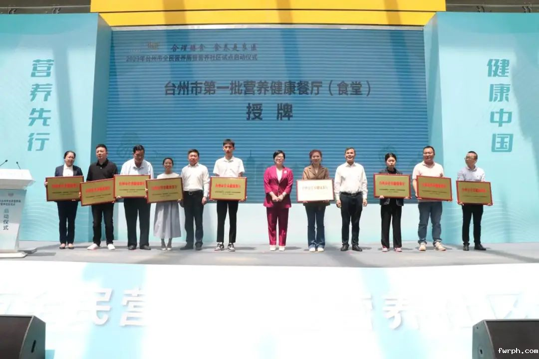 市级各部门领导上台为台州市第一批营养健康餐厅(食堂)授牌。
