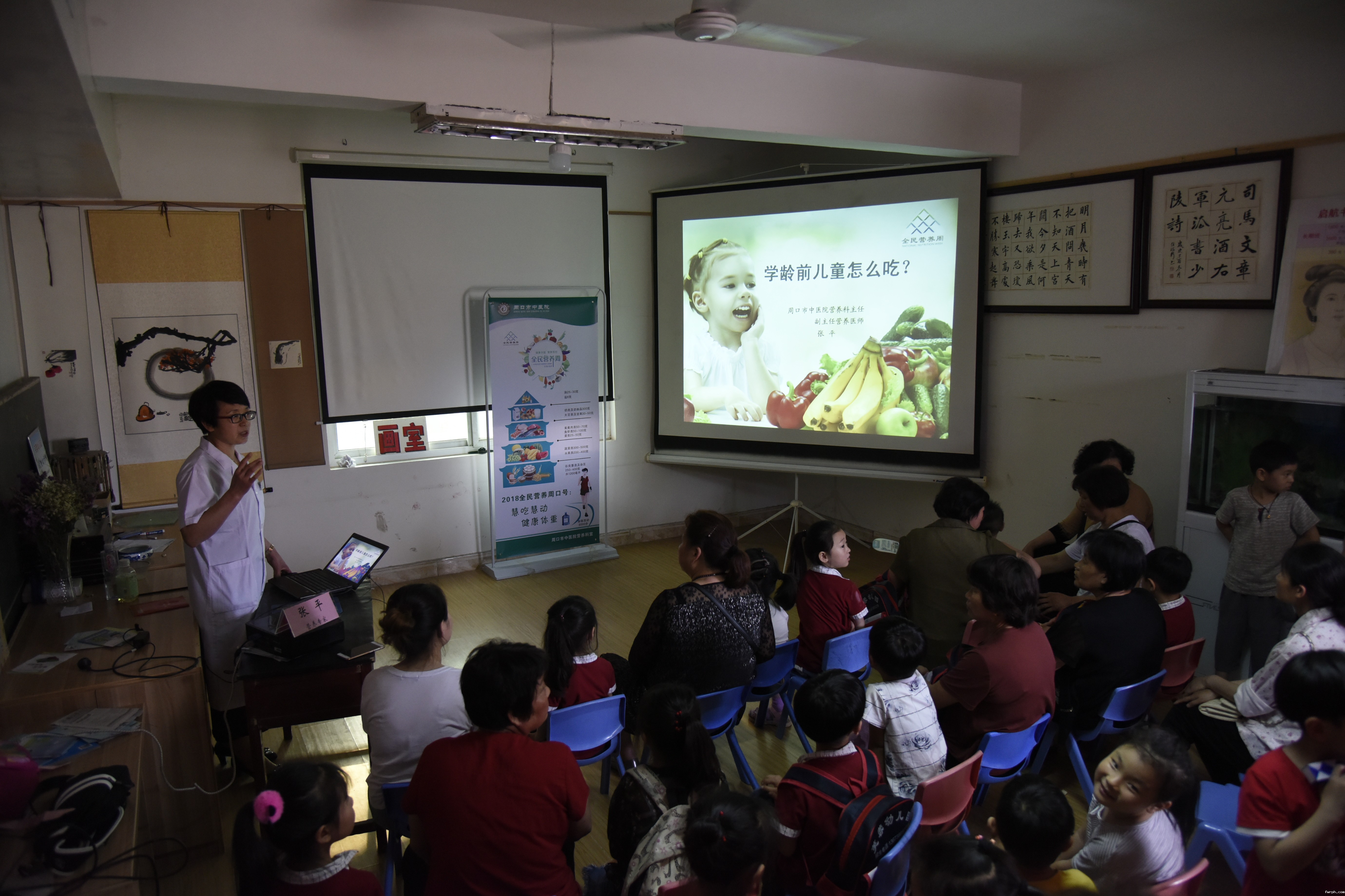周口市中医院的注册营养师张平为周口市芙蓉幼儿园举办的父母营养课堂。